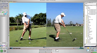 This is the SwingView Pro TM Comparison screen used to view swings side by side. The swings can be easily moved with the mouse to get the desired swing positions. The swings are automatically synchronized so that they reach the impact of the swing simultaneously. Compare front and back angles with dual-camera capture or compare the student to a pro swing.
